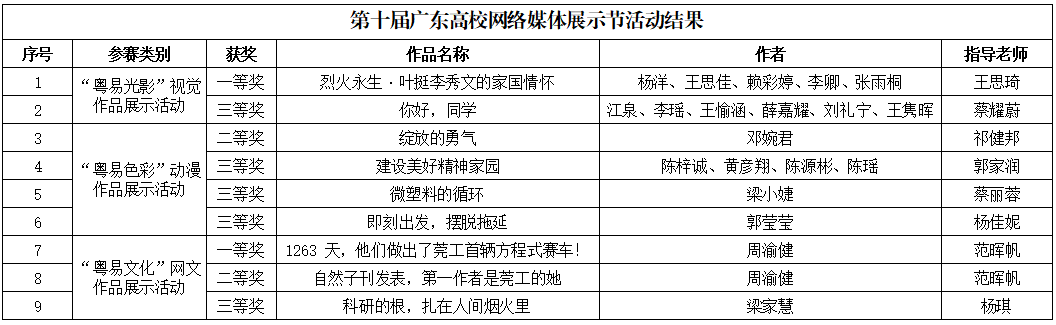 第十届广东高校网络媒体展示节活动,我校荣获一等奖2项、二等奖2项、三等奖5项。