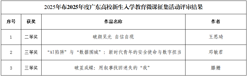 2025年度广东高校新生入学教育微课征集活动,我校荣获二等奖1项、三等奖2项。