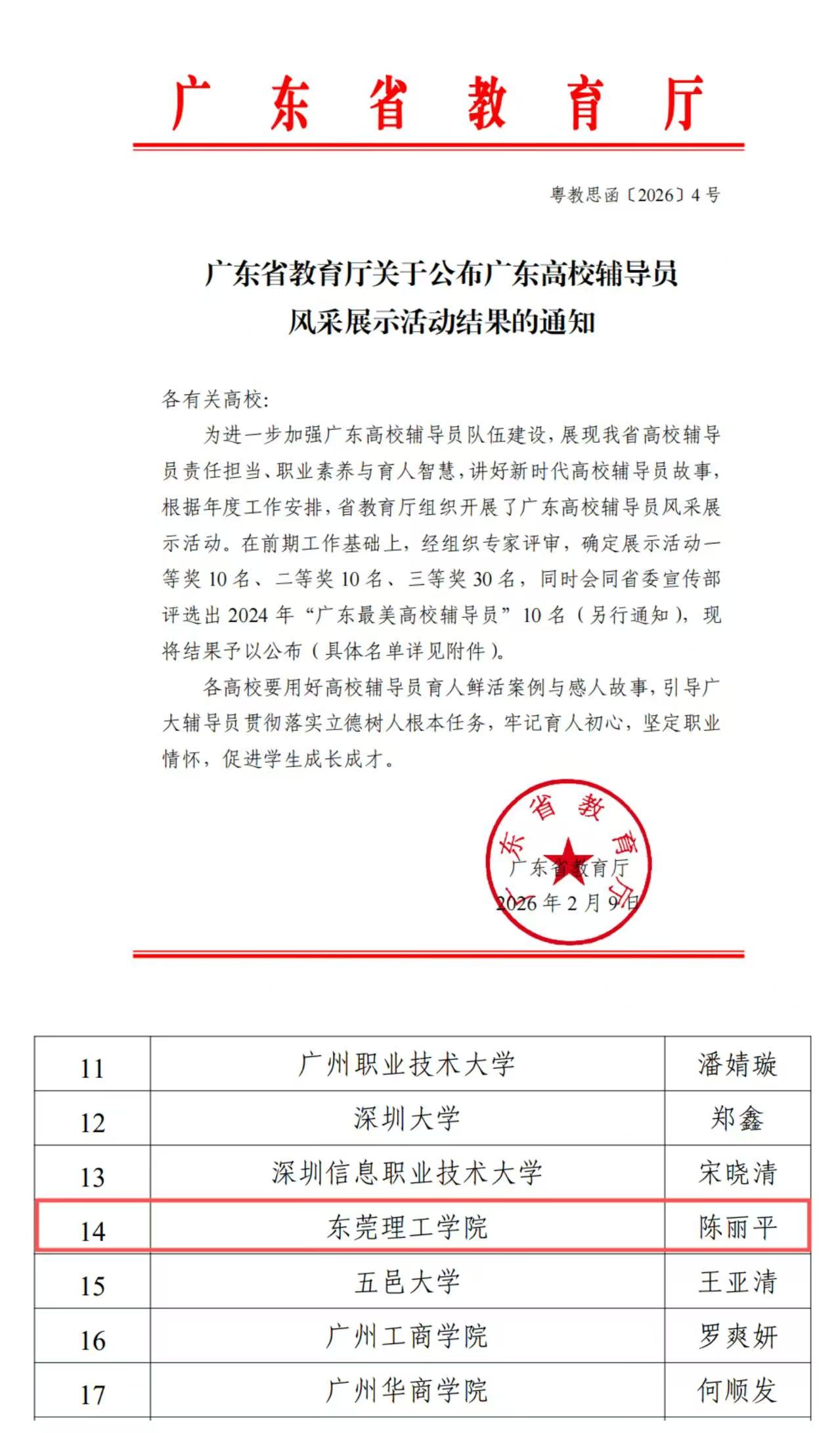 近日,广东省教育厅公布2024年“广东最美高校辅导员”推选展示活动评选结果。我校学生社区知行学院辅导员陈丽平荣获三等奖,充分展现了我校辅导员队伍的专业素养与育人风采。