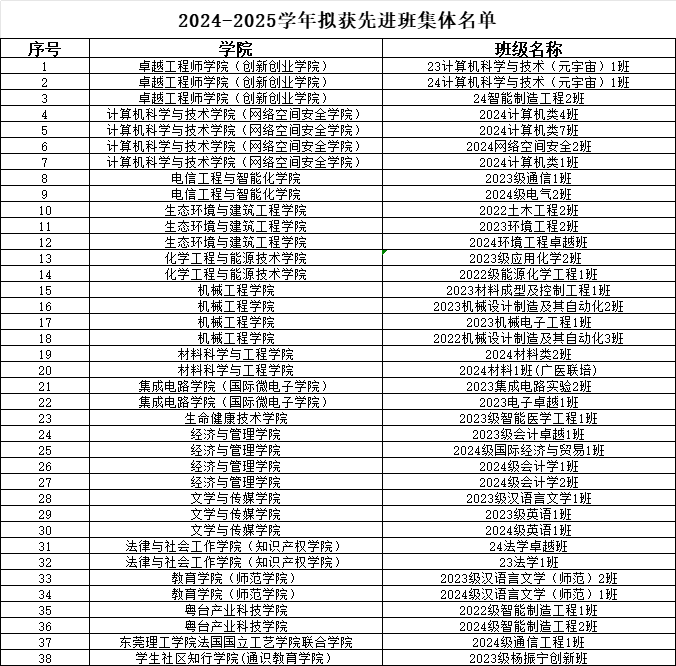 根据《东莞理工学院先进班集体、优秀大学生标兵、优秀大学生、优秀学生干部评选办法》、《东莞理工学院本专科优秀学生奖学金评选办法》和《东莞理工学院“杨振宁创新班”优秀学生奖学金评定办法》的有关规定,按照《关于评选2024-2025学年度先进班集体、优秀大学生标兵、优秀大学生、优秀学生干部及评定奖学金的通知》