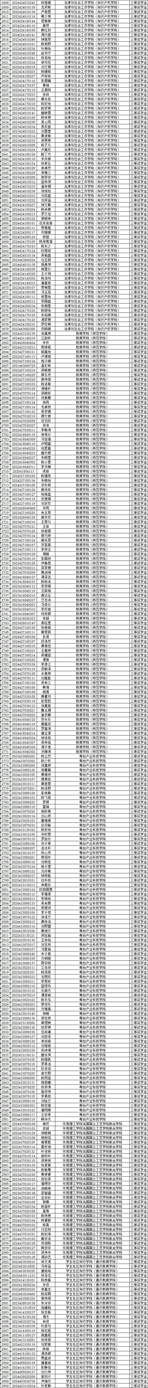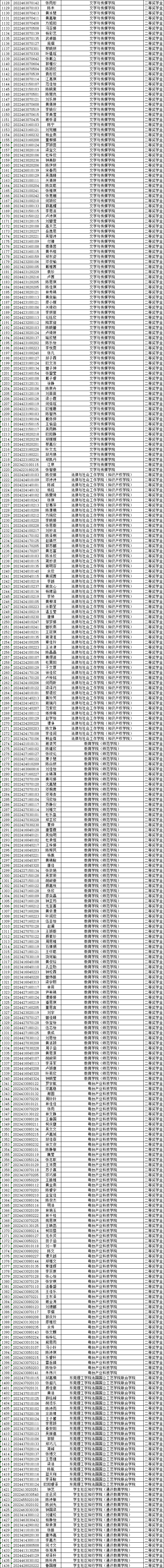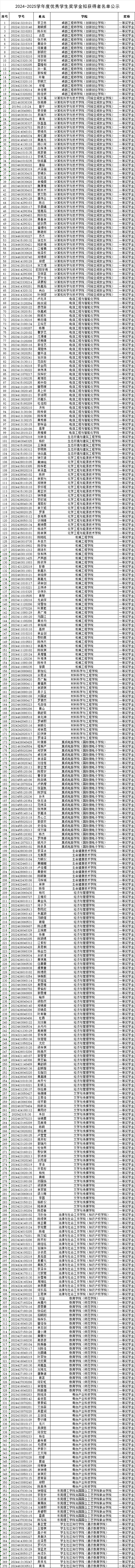 根据《东莞理工学院先进班集体、优秀大学生标兵、优秀大学生、优秀学生干部评选办法》、《东莞理工学院本专科优秀学生奖学金评选办法》和《东莞理工学院“杨振宁创新班”优秀学生奖学金评定办法》的有关规定,按照《关于评选2024-2025学年度先进班集体、优秀大学生标兵、优秀大学生、优秀学生干部及评定奖学金的通知》 (学工通〔2025〕30号)文件要求,现对我校2024—2025学年度优秀学生奖学金拟获得者名单进行为期5个工作日的公示。若对人选有不同意见或发现人选有违规行为请电话、来函、来访、电子邮件等方式向学生工作部反映,反映问题实事求是,电话、信函和电子邮件应告知真实姓名。